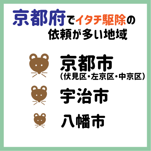 京都でイタチ駆除の多い地域は、やはり京都市が一番多く、特に住宅地で発生しています。