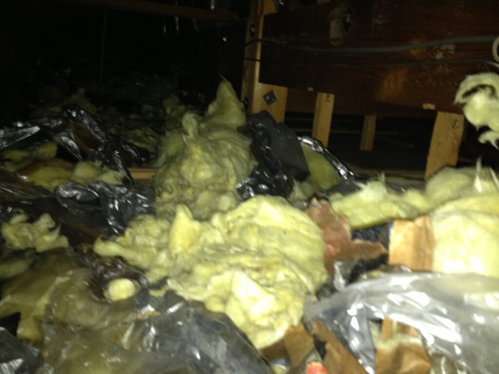 断熱材の上ではイタチの音が聞こえにくく、しばらく気づかないことも多く、気付いた時には、写真のように、被害がかなり深刻になっている場合があります。
