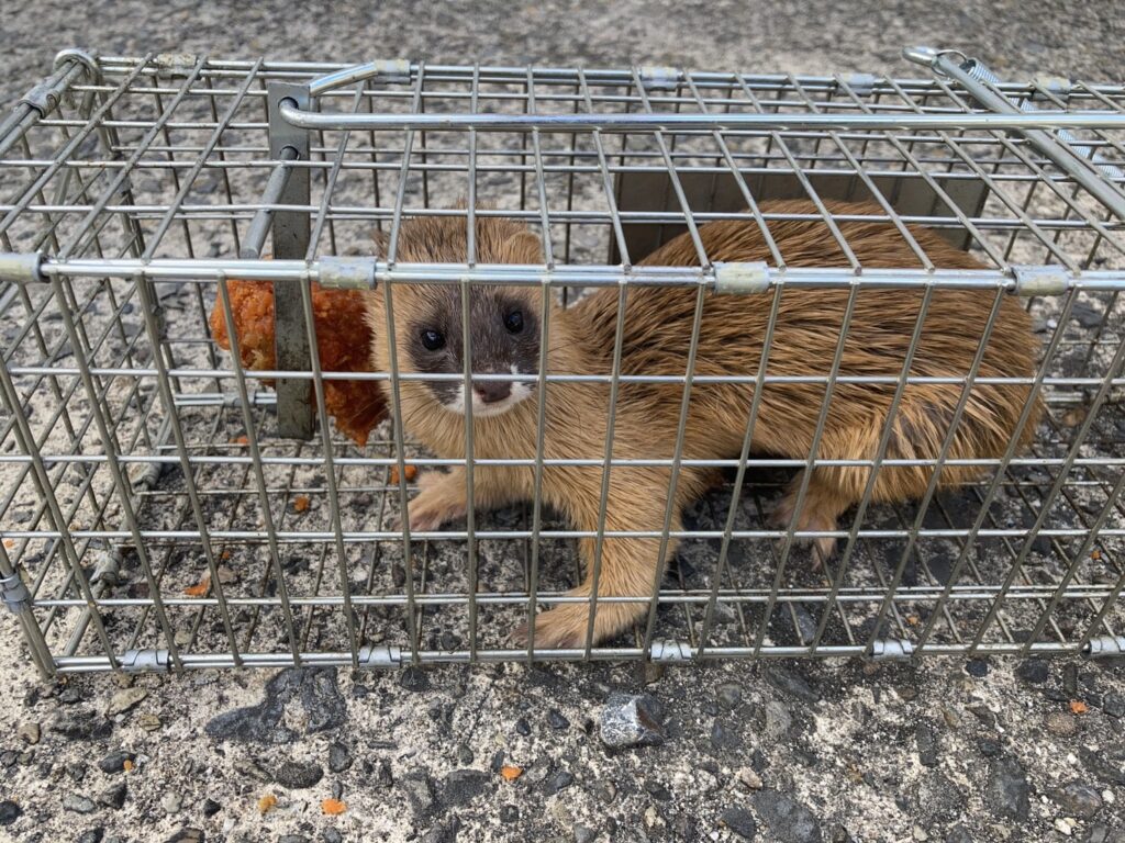 確かに天井裏にはまだフンもなく、イタチも見当たらない状況でしたので、侵入口付近に捕獲カゴを設置したところ、イタチを捕まえることができました。